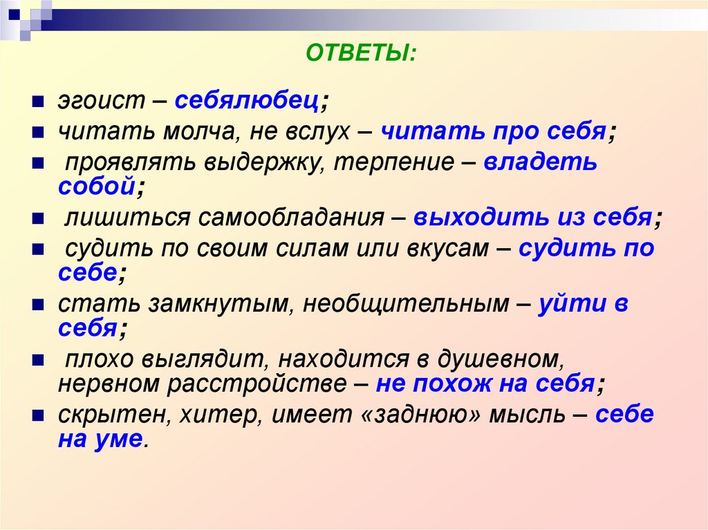 эгоист – себялюбец;читать молча, не вслух – читать про себя;