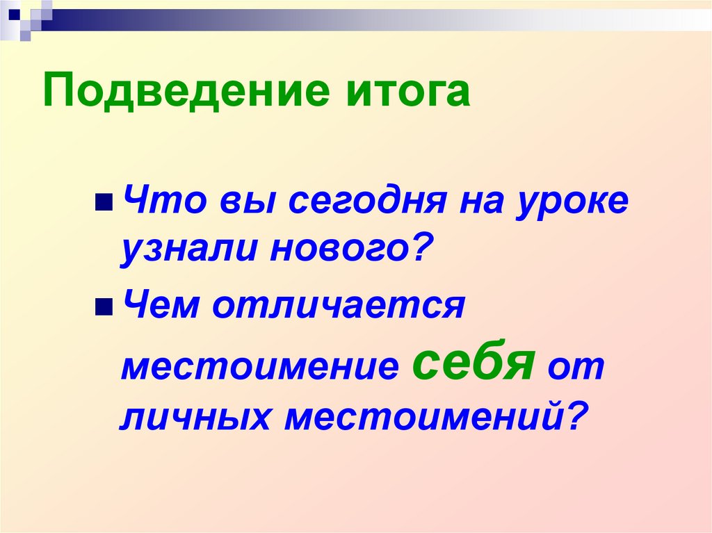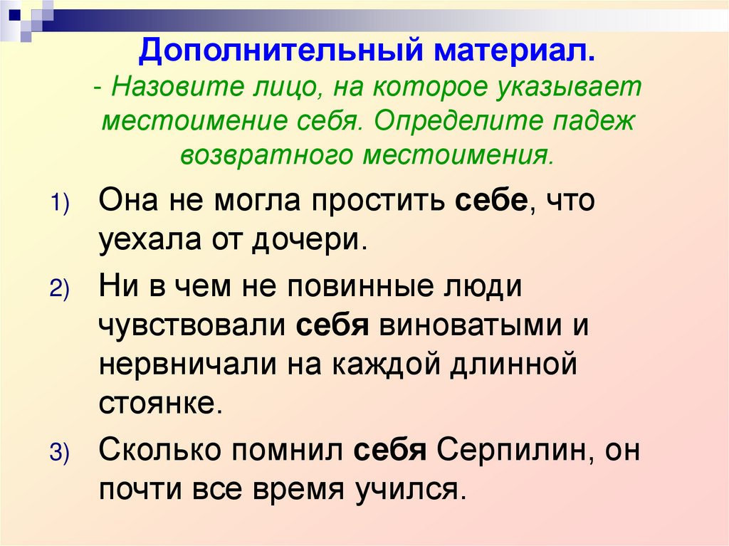 23. Дополнительный материал. - Назовите лицо, на которое указывает местоимение себя. Определите падеж возвратного местоимения.
