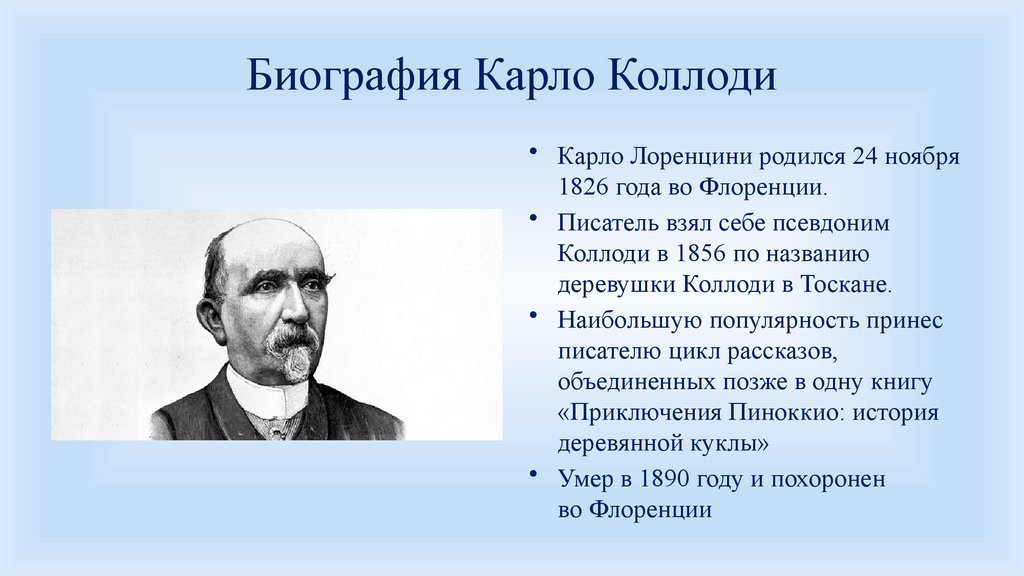 Биография Карло Коллоди• Карло Лоренцини родился 24 ноября