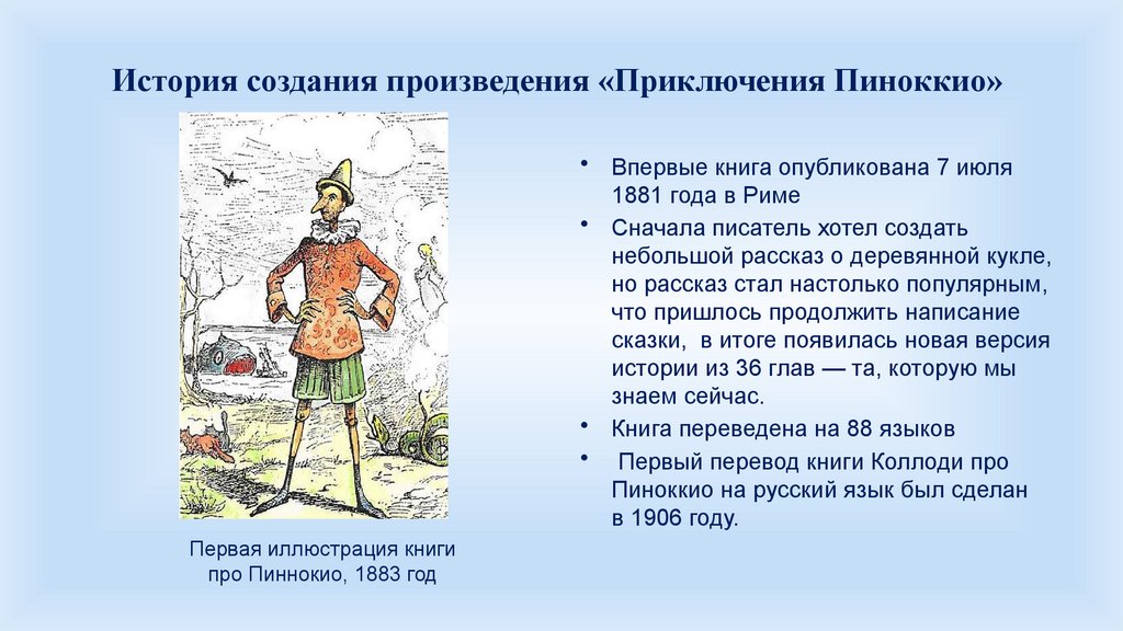 История создания произведения «Приключения Пиноккио»• Впервые книга опубликована 7 июля