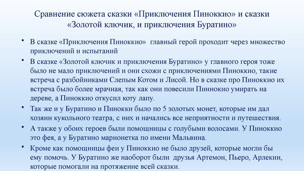 Сравнительный анализ сюжета и главных персонажей сказок «Приключения Пиноккио» и «Золотой ключик, и приключения Буратино»