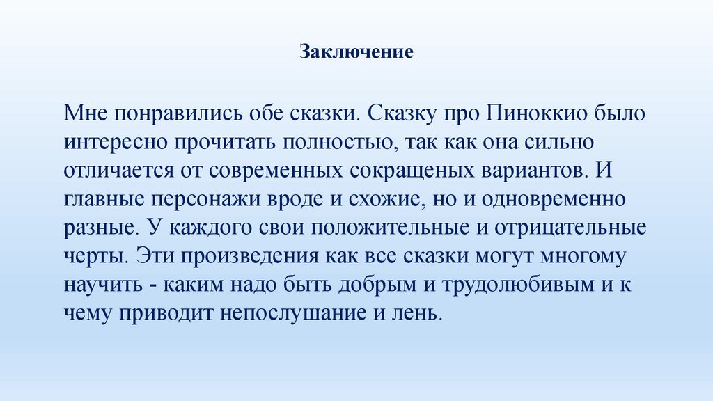ЗаключениеМне понравились обе сказки. Сказку про Пиноккио было