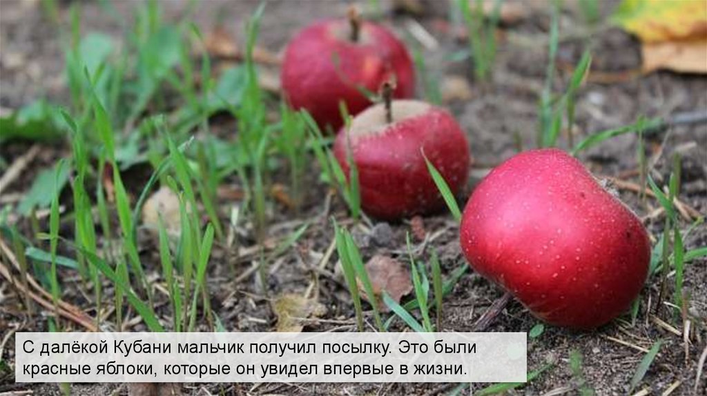 С далёкой Кубани мальчик получил посылку. Это быликрасные яблоки, которые он увидел впервые в жизни.