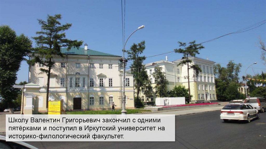 Школу Валентин Григорьевич закончил с однимипятёрками и поступил в Иркутский университет на