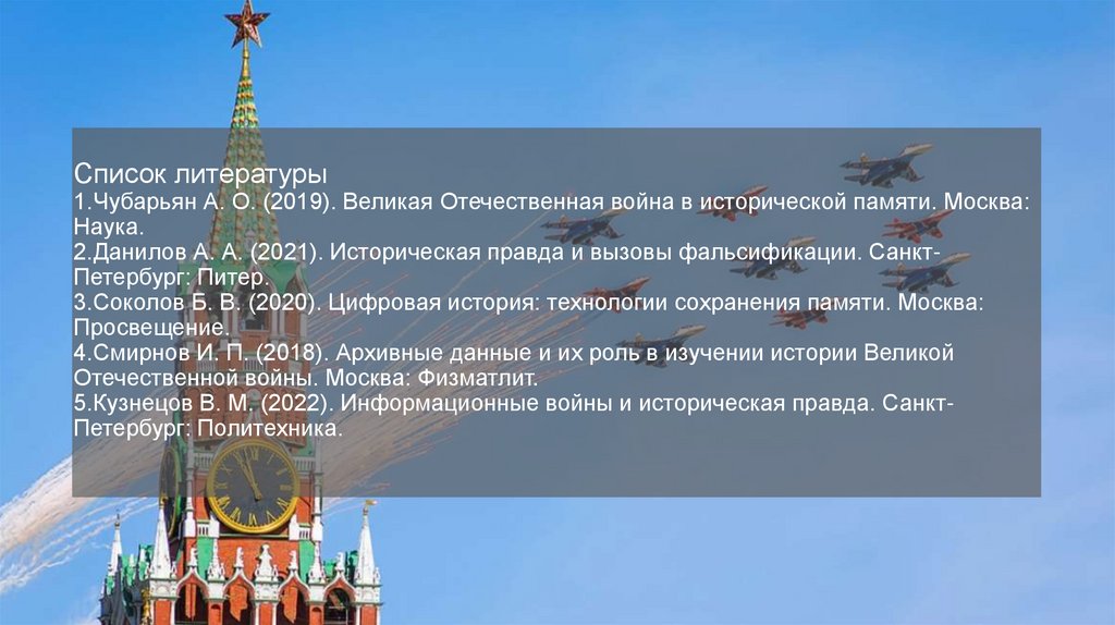 Список литературы1.Чубарьян А. О. (2019). Великая Отечественная война в исторической памяти. Москва: