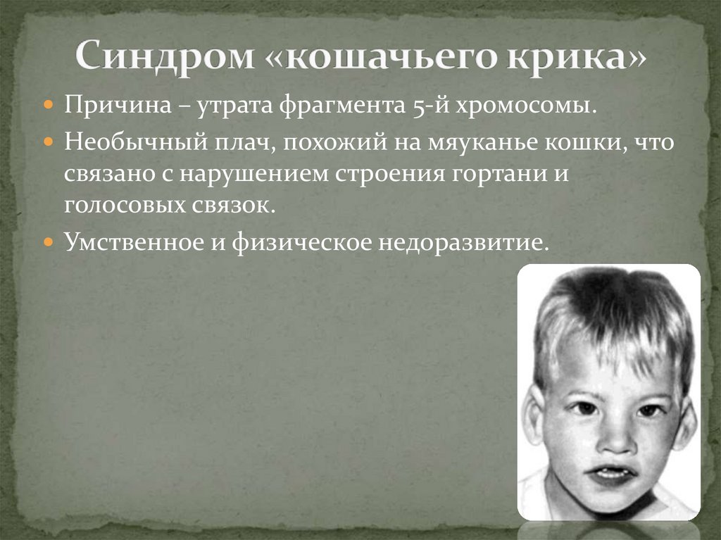 Причина – утрата фрагмента 5-й хромосомы.Необычный плач, похожий на мяуканье кошки, что