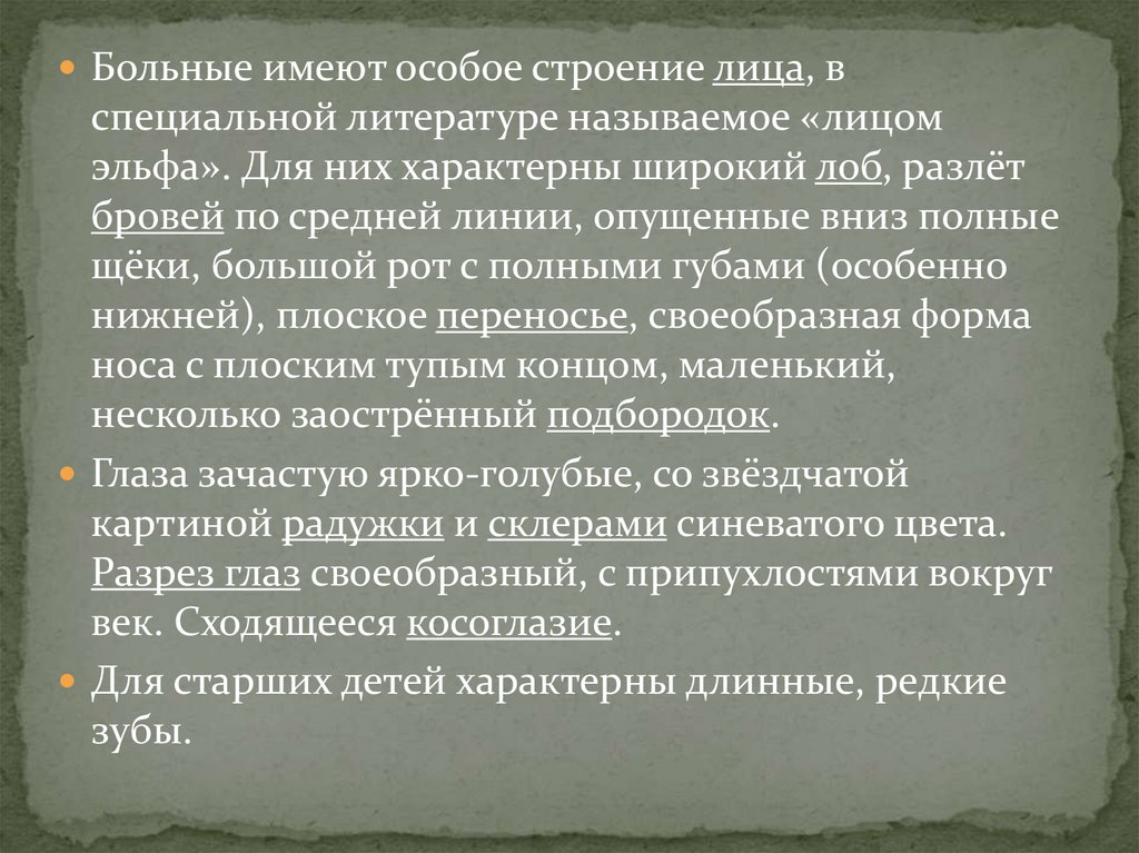 Больные имеют особое строение лица, вспециальной литературе называемое «лицом
