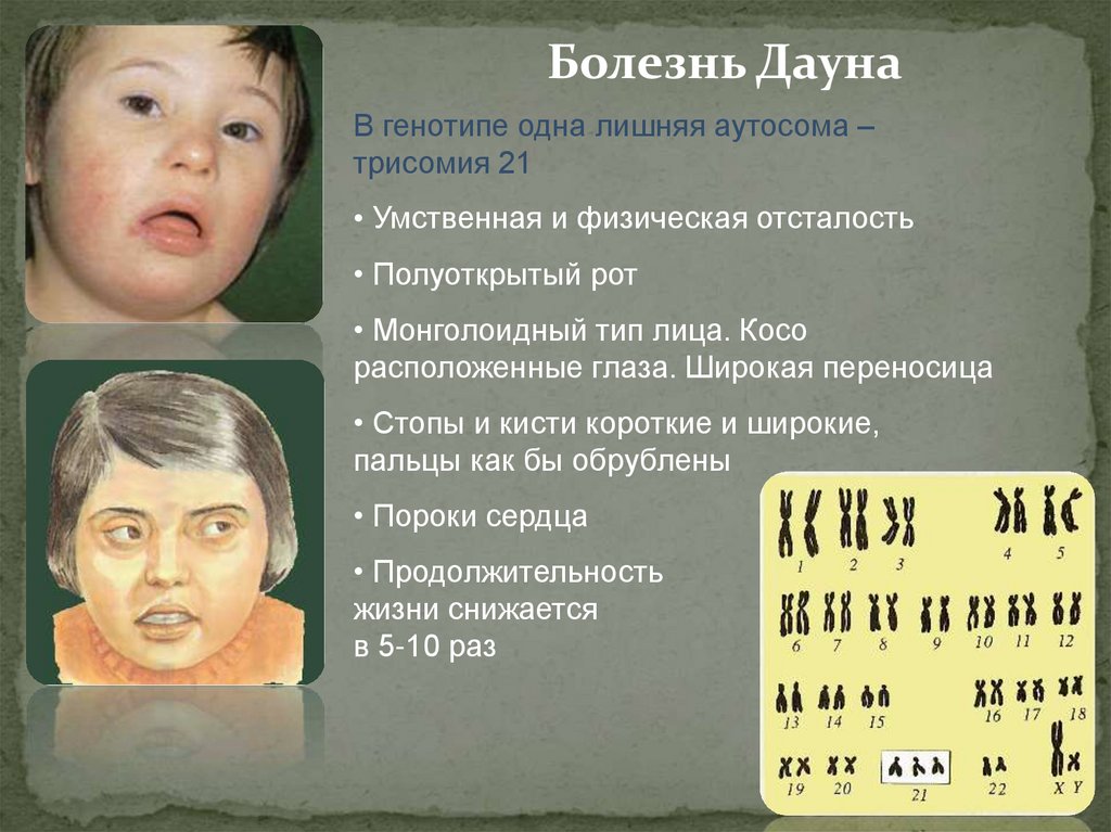 Болезнь ДаунаВ генотипе одна лишняя аутосома –