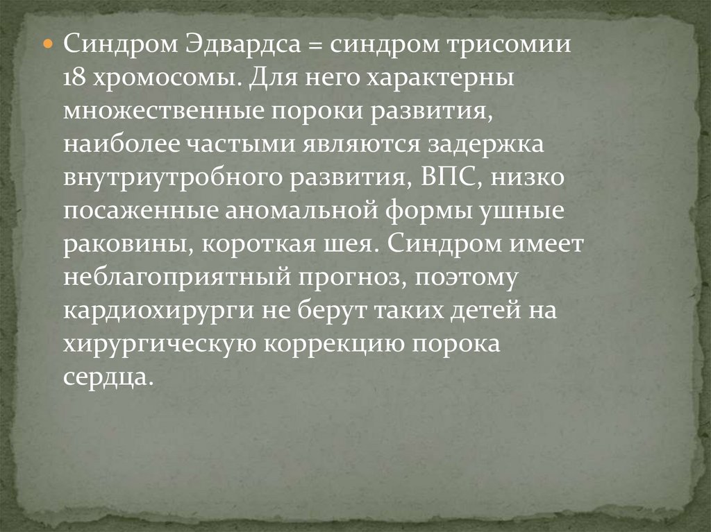 Синдром Эдвардса = синдром трисомии18 хромосомы. Для него характерны