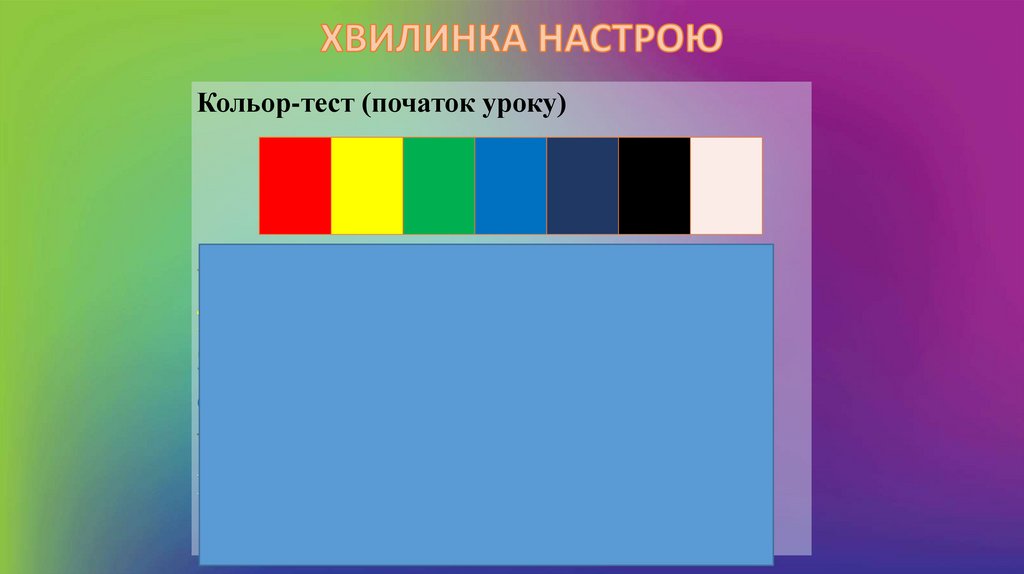 Кольор-тест (початок уроку)Червоний — активне прагнення до діяльності.