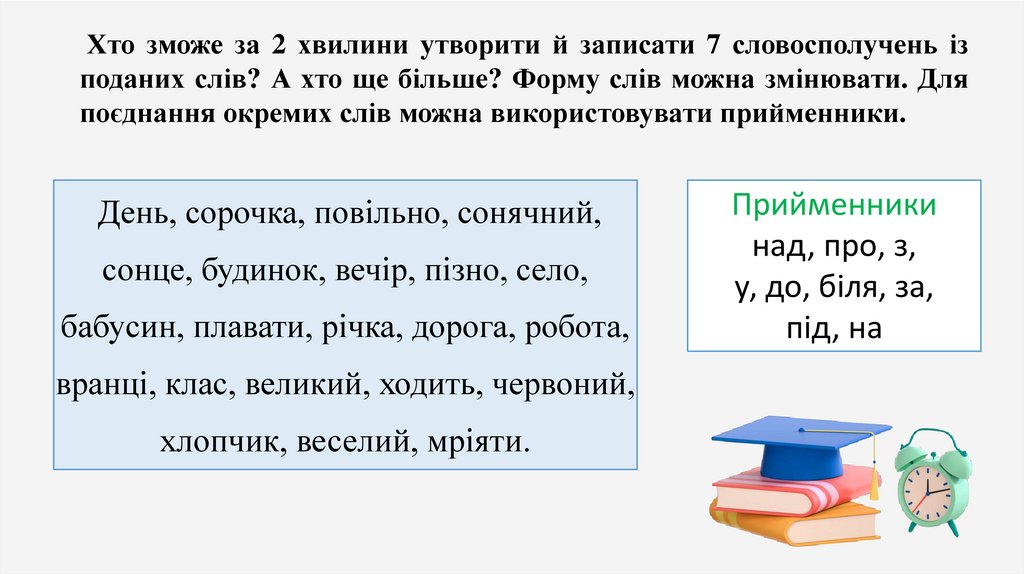 Хто зможе за 2 хвилини утворити й записати 7 словосполучень ізподаних слів? А хто ще більше? Форму слів можна змінювати. Для