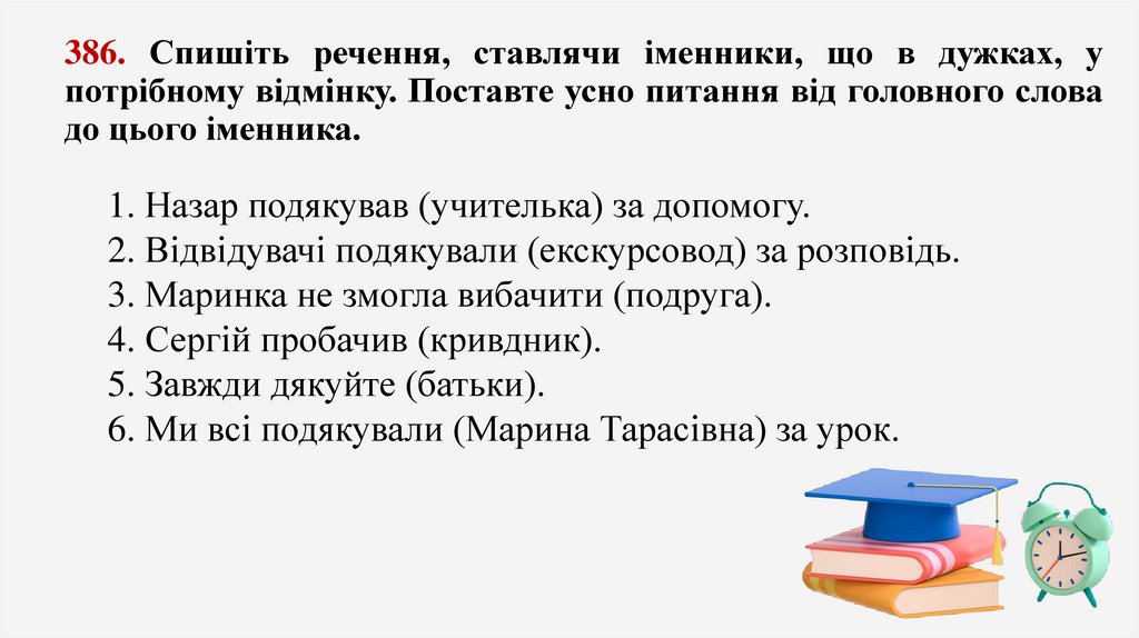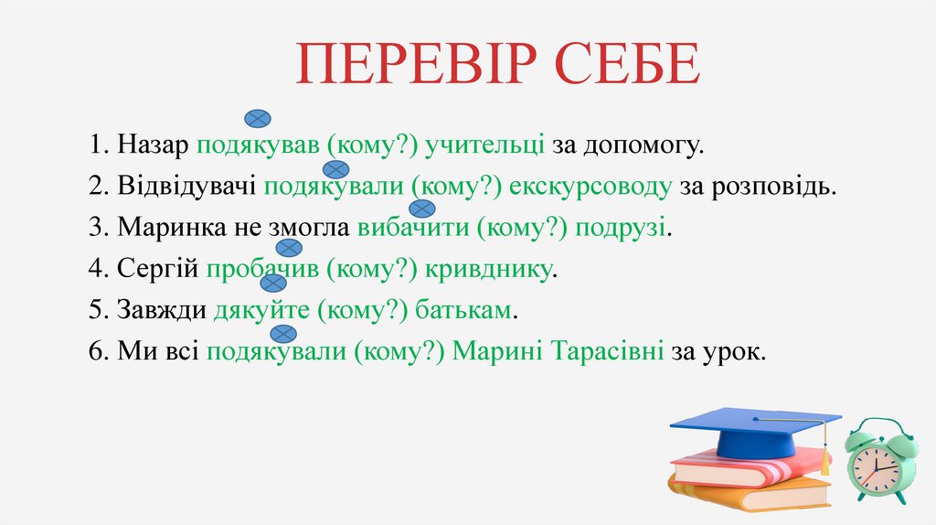 ПЕРЕВІР СЕБЕ1. Назар подякував (кому?) учительці за допомогу.
