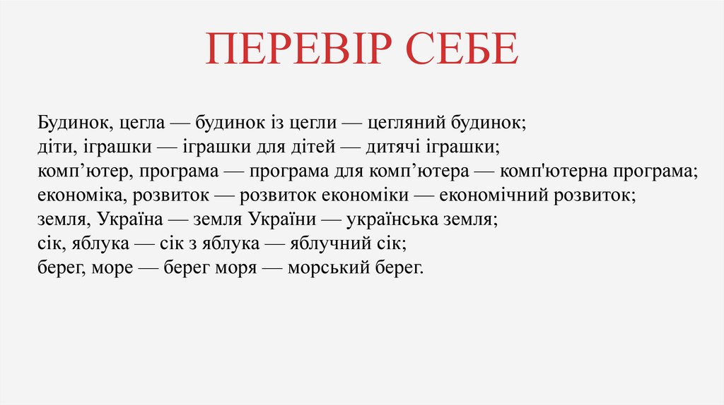 ПЕРЕВІР СЕБЕБудинок, цегла — будинок із цегли — цегляний будинок;