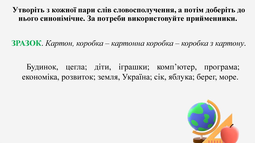 Утворіть з кожної пари слів словосполучення, а потім доберіть донього синонімічне. За потреби використовуйте прийменники.