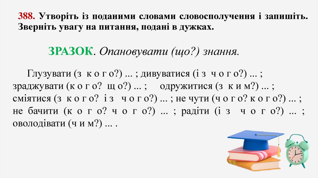388. Утворіть із поданими словами словосполучення і запишіть.Зверніть увагу на питання, подані в дужках.