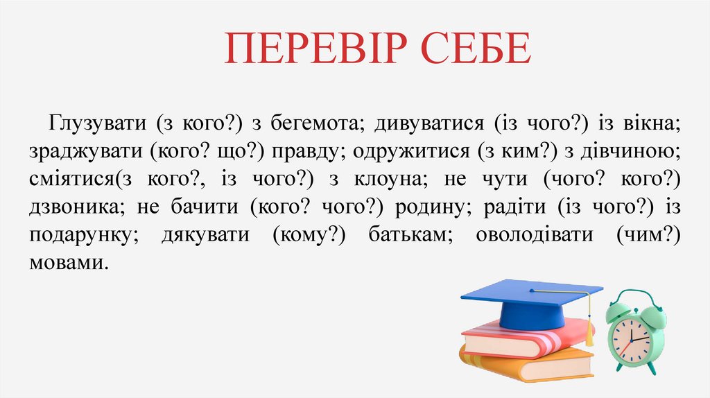 ПЕРЕВІР СЕБЕГлузувати (з кого?) з бегемота; дивуватися (із чого?) із вікна;