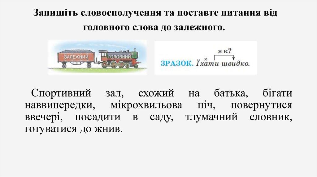 Запишіть словосполучення та поставте питання відголовного слова до залежного.