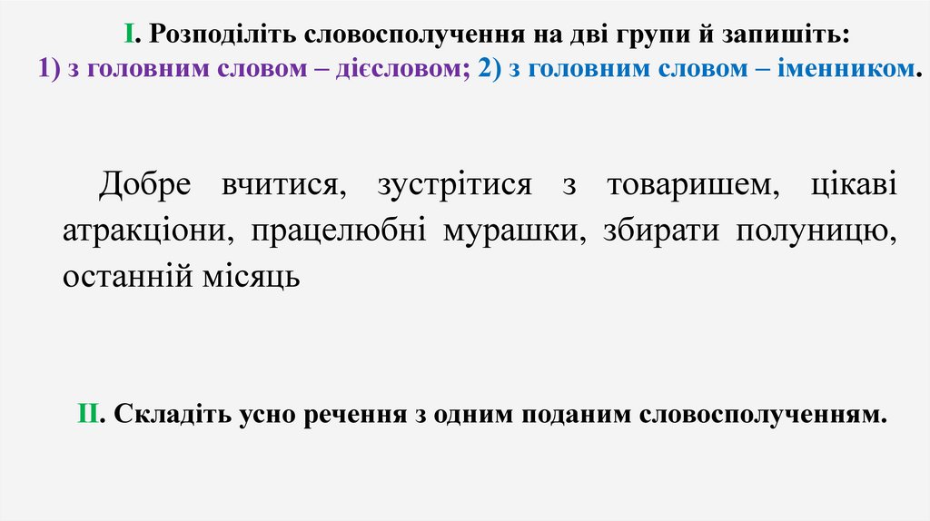 І. Розподіліть словосполучення на дві групи й запишіть:1) з головним словом – дієсловом; 2) з головним словом – іменником.