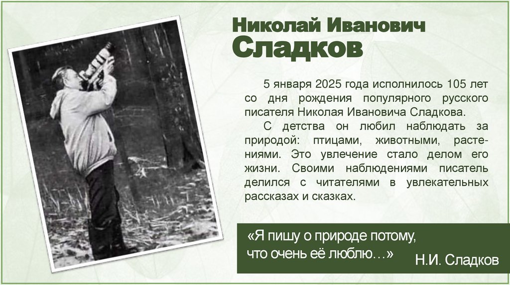 природой: птицами, животными, растениями. Это увлечение стало делом его