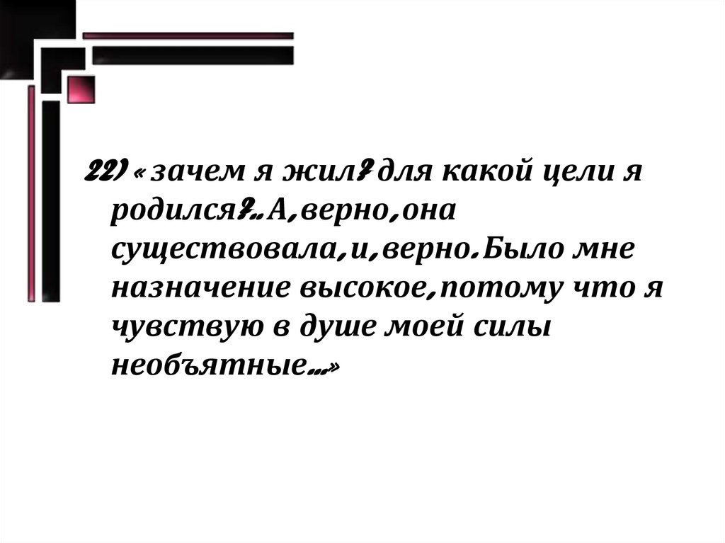 22) « зачем я жил? для какой цели яродился?.. А, верно, она