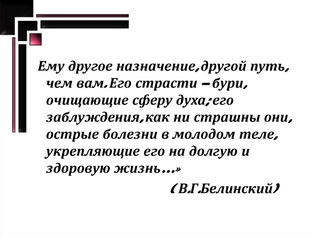 Ему другое назначение, другой путь,чем вам. Его страсти – бури,