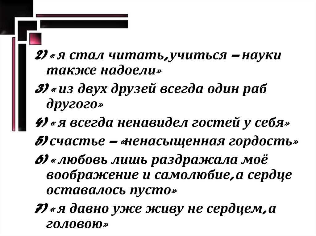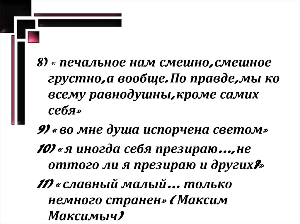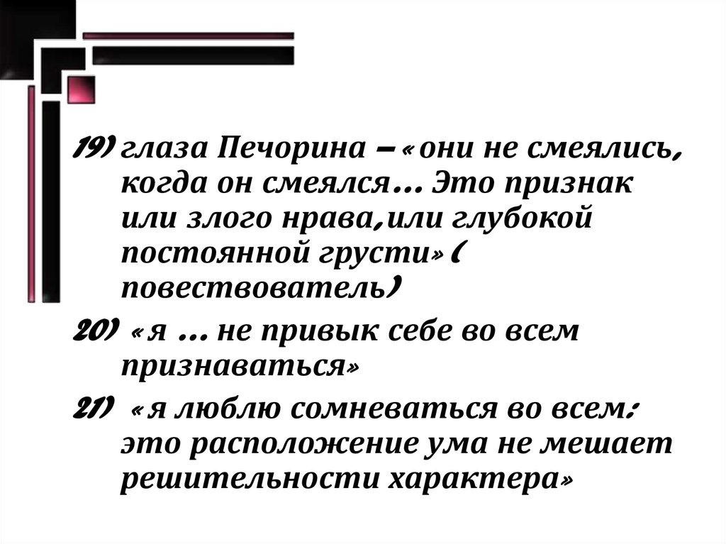 19) глаза Печорина – « они не смеялись,когда он смеялся… Это признак