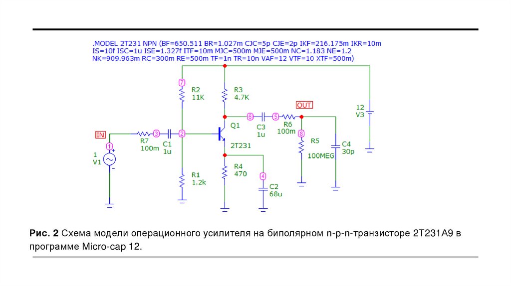 Рис. 2 Схема модели операционного усилителя на биполярном n-p-n-транзисторе 2Т231А9 впрограмме Micro-cap 12.