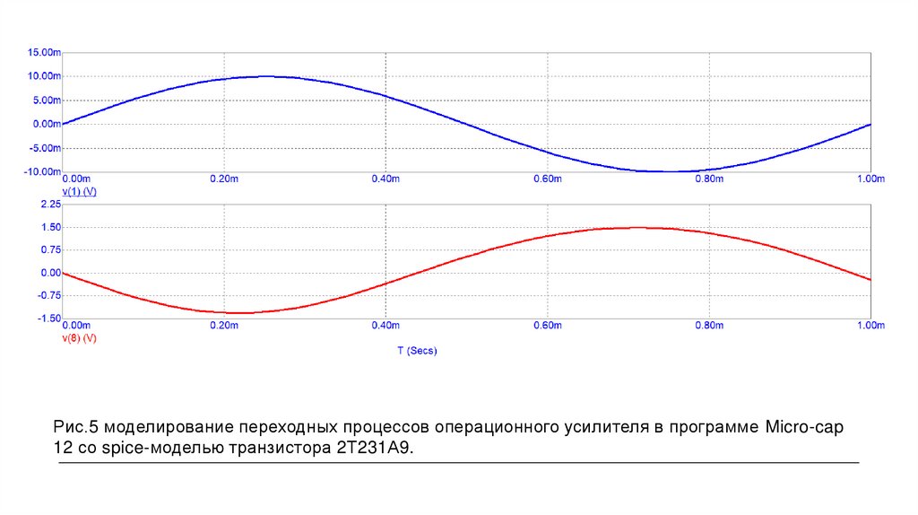 Рис.5 моделирование переходных процессов операционного усилителя в программе Micro-cap12 со spice-моделью транзистора 2Т231А9.