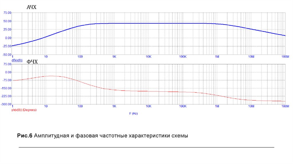 Рис.6 Амплитудная и фазовая частотные характеристики схемы