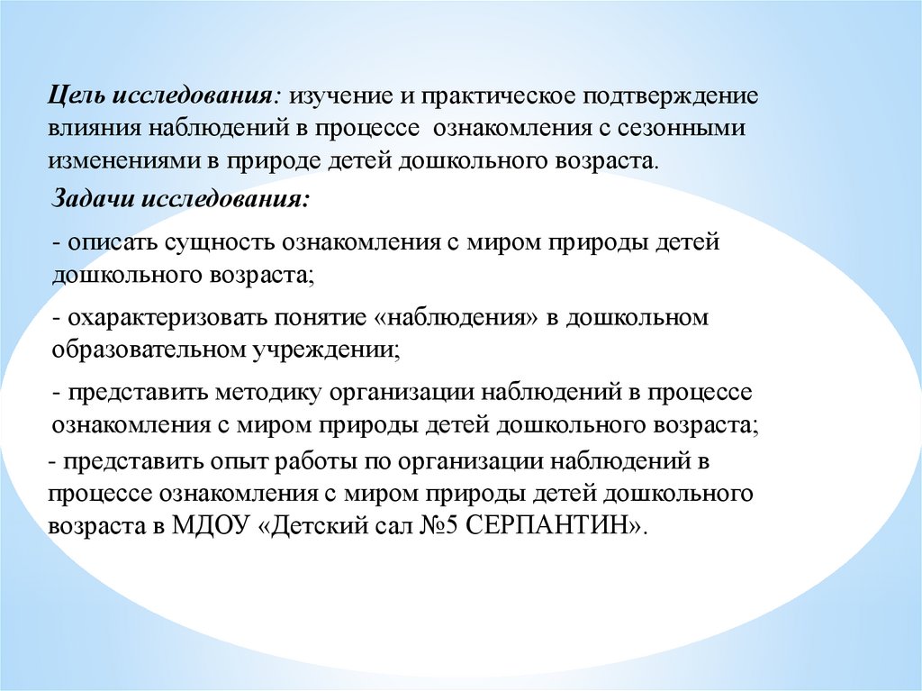 Цель исследования: изучение и практическое подтверждениевлияния наблюдений в процессе ознакомления с сезонными