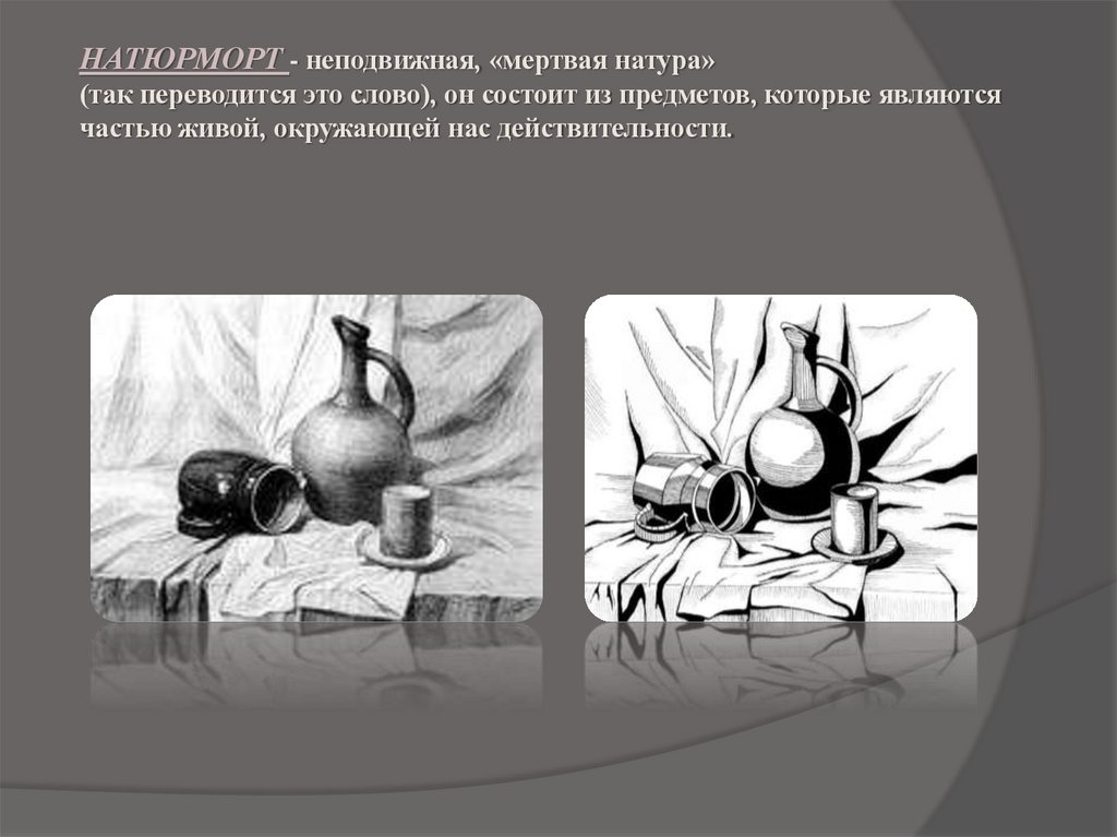 НАТЮРМОРТ - неподвижная, «мертвая натура»(так переводится это слово), он состоит из предметов, которые являются