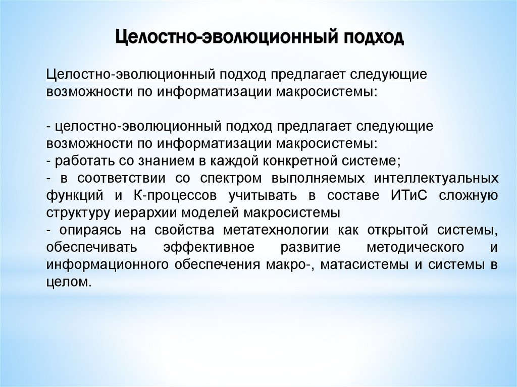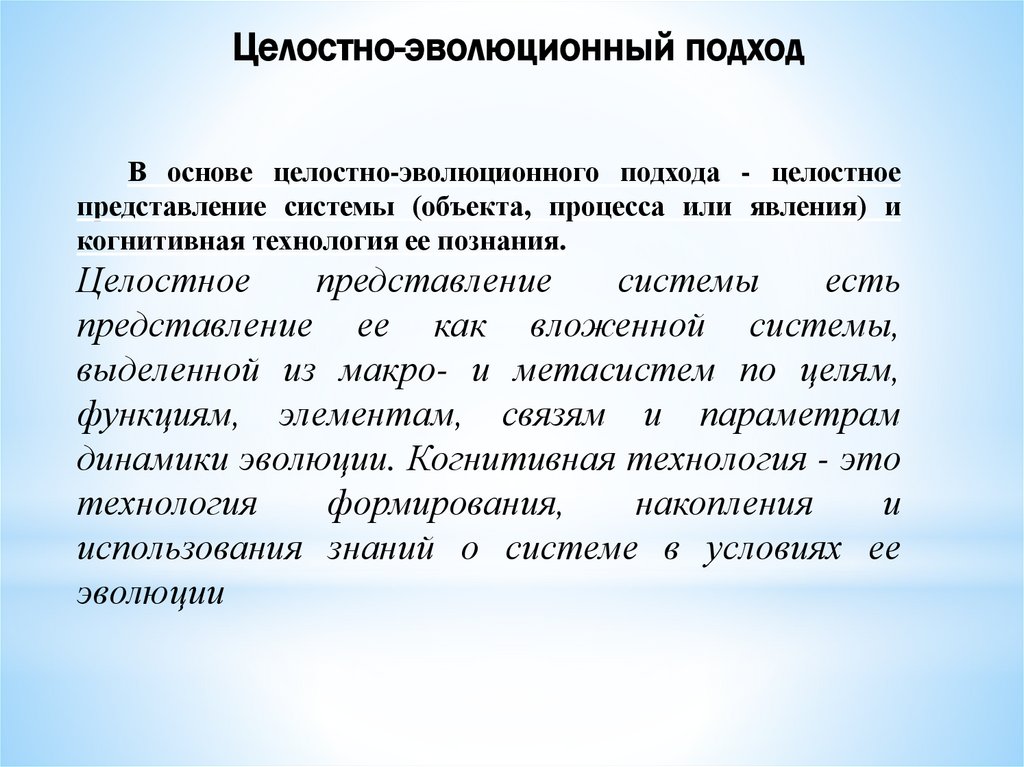 Целостно-эволюционный подходЦелостно-эволюционный подход предлагает следующие