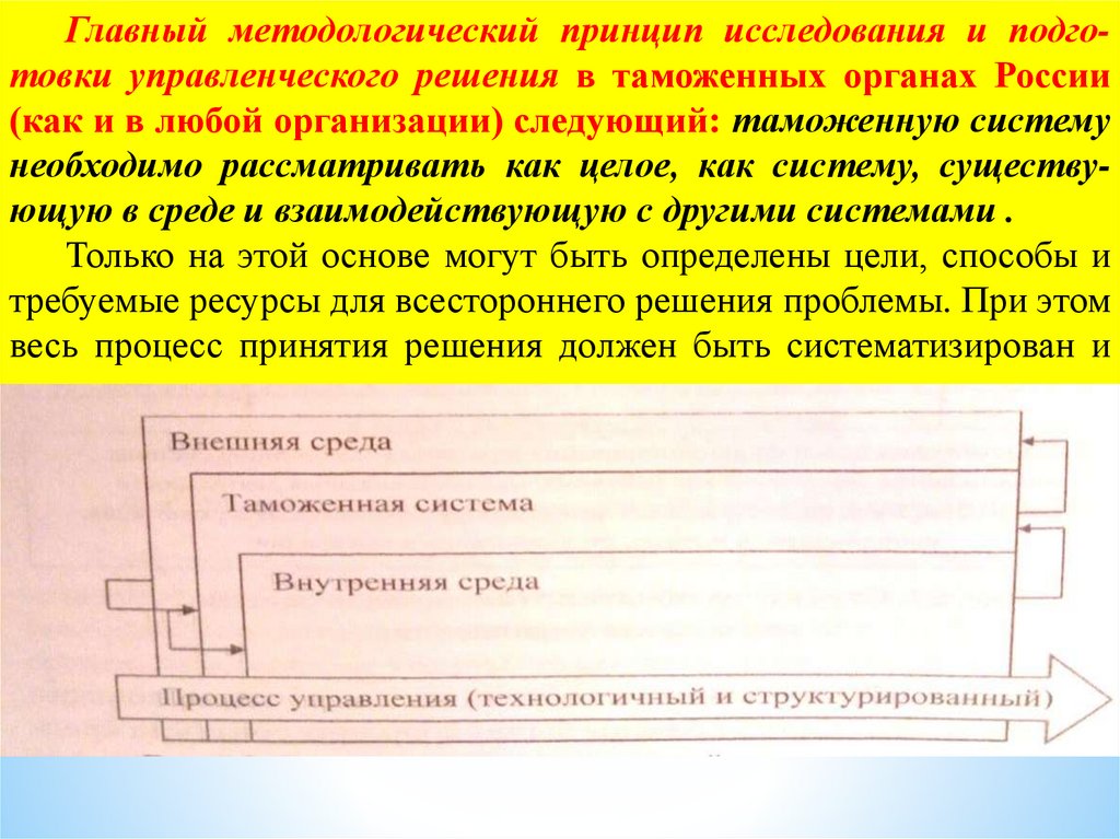 Главный методологический принцип исследования и подготовки управленческого решения в таможенных органах России(как и в любой организации) следующий: таможенную систему