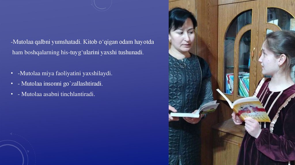 -Mutolaa qalbni yumshatadi. Kitob o‘qigan odam hayotdaham boshqalarning his-tuyg‘ularini yaxshi tushunadi.