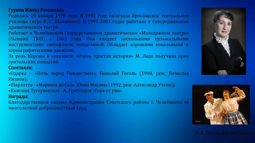 Гурина Жанна РомановнаРодилась 19 января 1970 года. В 1991 году окончила Ярославское театральное