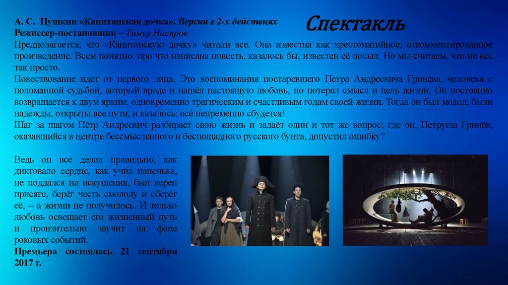 СпектакльА. С. Пушкин «Капитанская дочка». Версия в 2-х действиях
