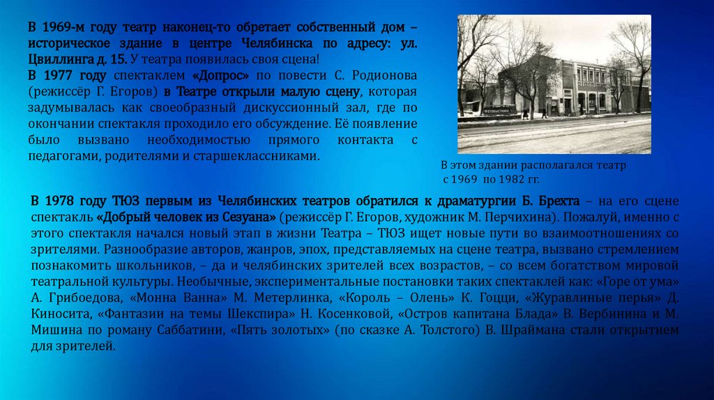 В 1978 году ТЮЗ первым из Челябинских театров обратился к драматургии Б. Брехта – на его сцене