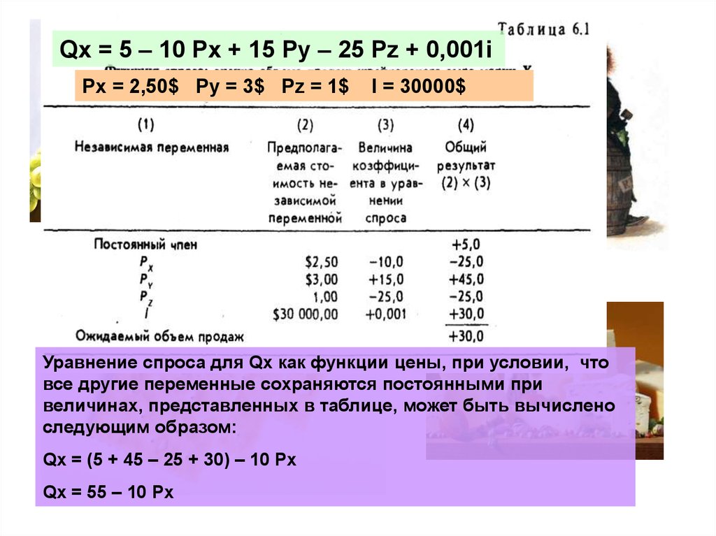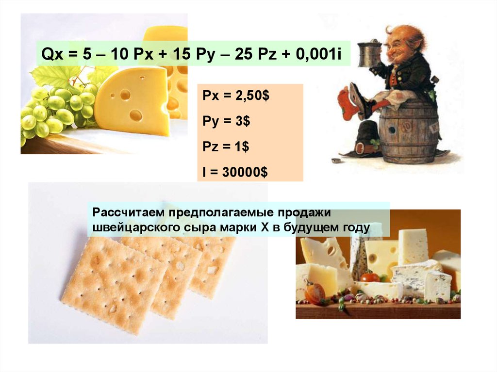 Qx = 5 – 10 Px + 15 Py – 25 Pz + 0,001iЦена за 1 кг