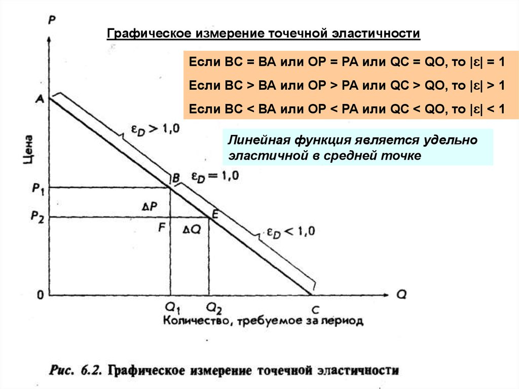 Графическое измерение точечной эластичностиЕсли BC = ВА или ОР = РА или QC = QO, то |ɛ| = 1