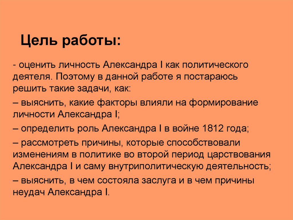 Цель работы:- оценить личность Александра I как политического