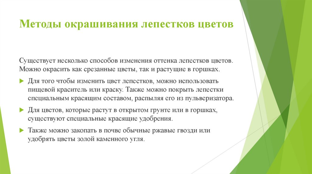 Методы окрашивания лепестков цветовСуществует несколько способов изменения оттенка лепестков цветов.