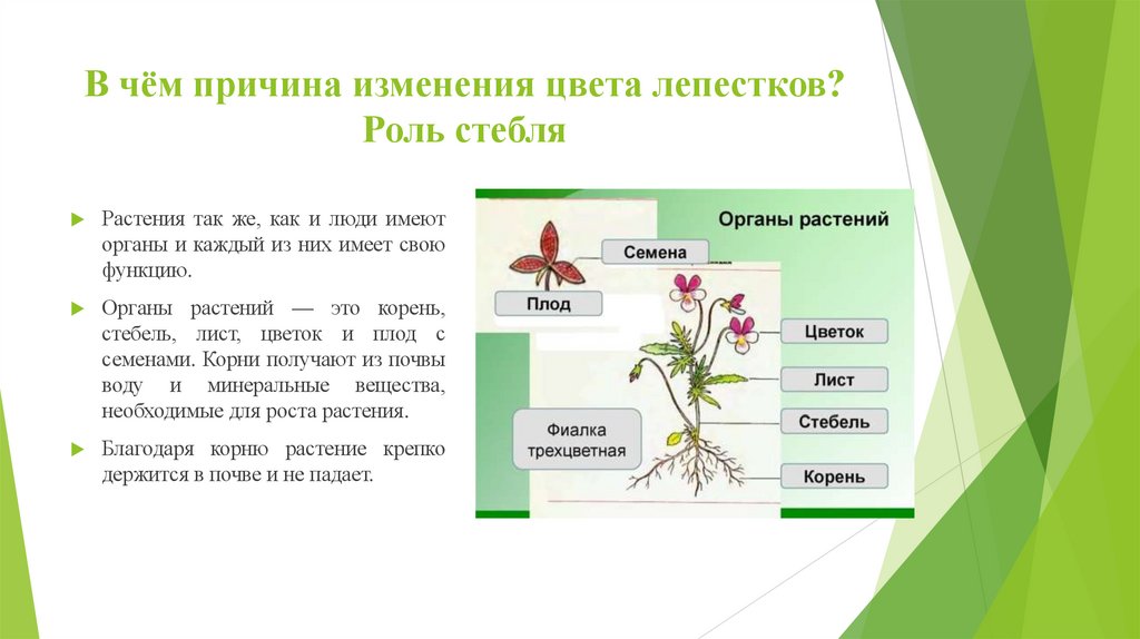 В чём причина изменения цвета лепестков?Роль стебля