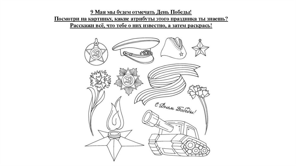 9 Мая мы будем отмечать День Победы!Посмотри на картинку, какие атрибуты этого праздника ты знаешь?