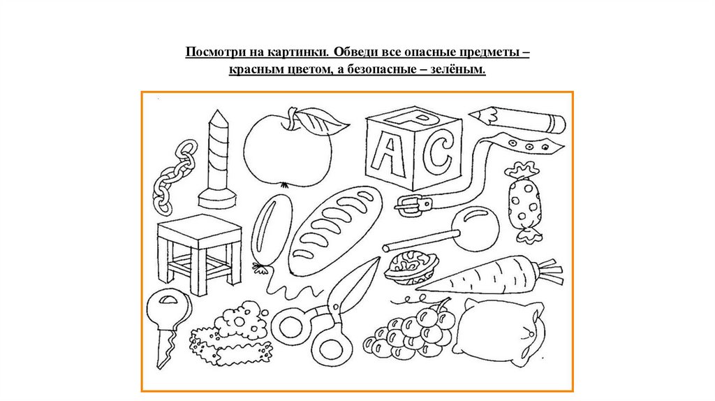 Посмотри на картинки. Обведи все опасные предметы –красным цветом, а безопасные – зелёным.