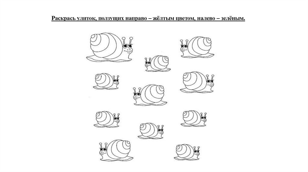 Раскрась улиток, ползущих направо – жёлтым цветом, налево – зелёным.5.