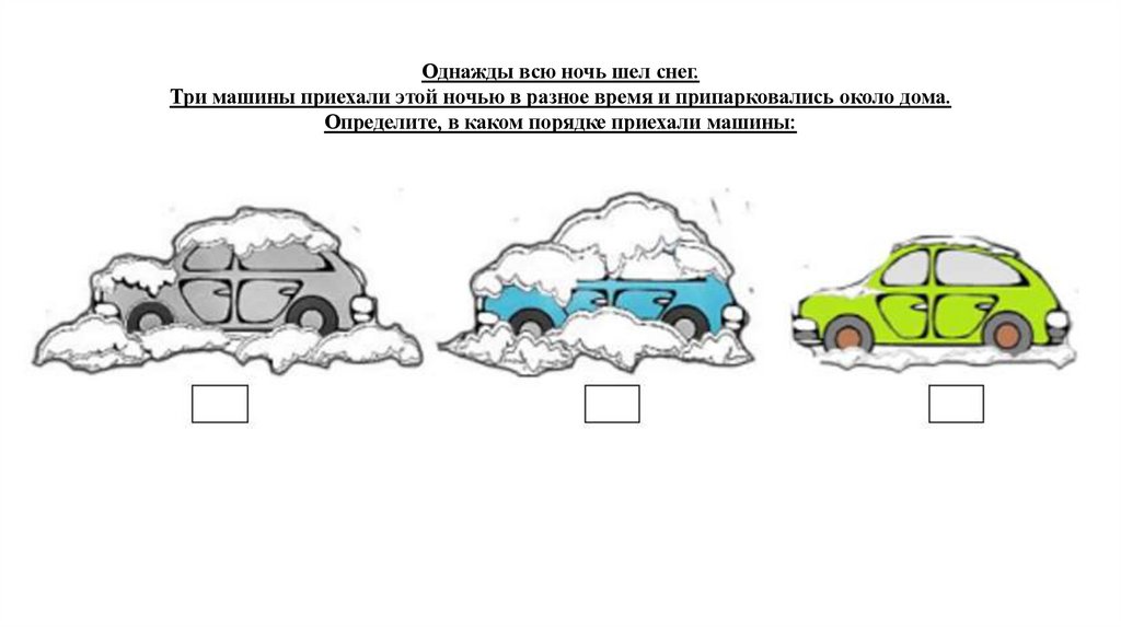 Однажды всю ночь шел снег.Три машины приехали этой ночью в разное время и припарковались около дома.