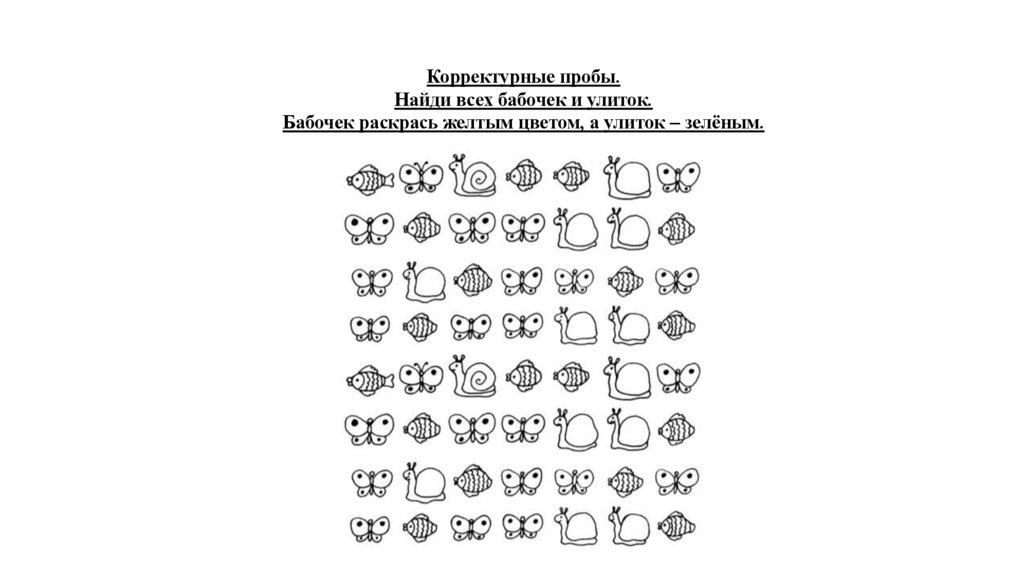 Корректурные пробы.Найди всех бабочек и улиток.