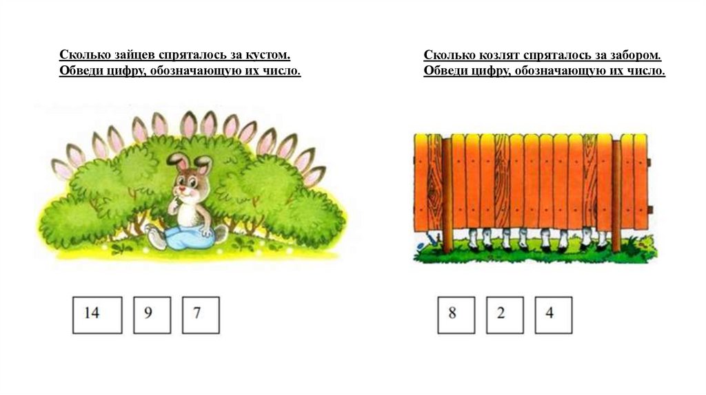 Сколько зайцев спряталось за кустом.Обведи цифру, обозначающую их число.