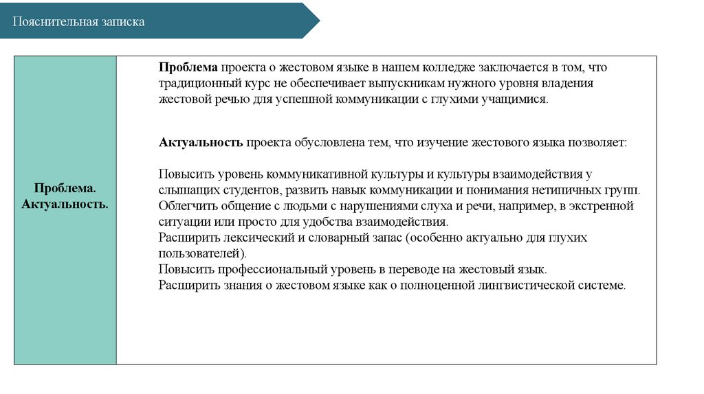 Пояснительная запискаПроблема проекта о жестовом языке в нашем колледже заключается в том, что