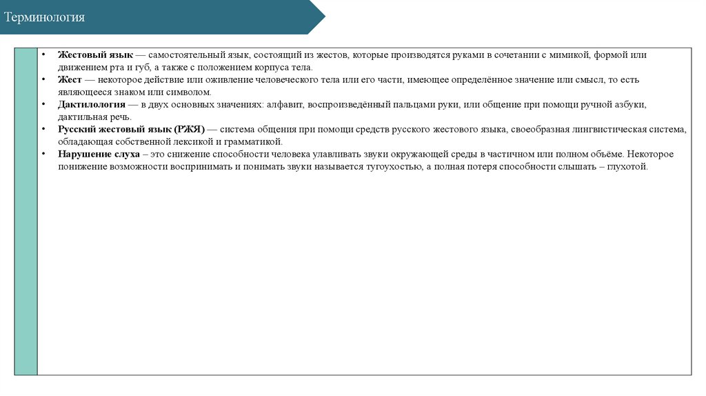 ТерминологияЖестовый язык — самостоятельный язык, состоящий из жестов, которые производятся руками в сочетании с мимикой, формой или